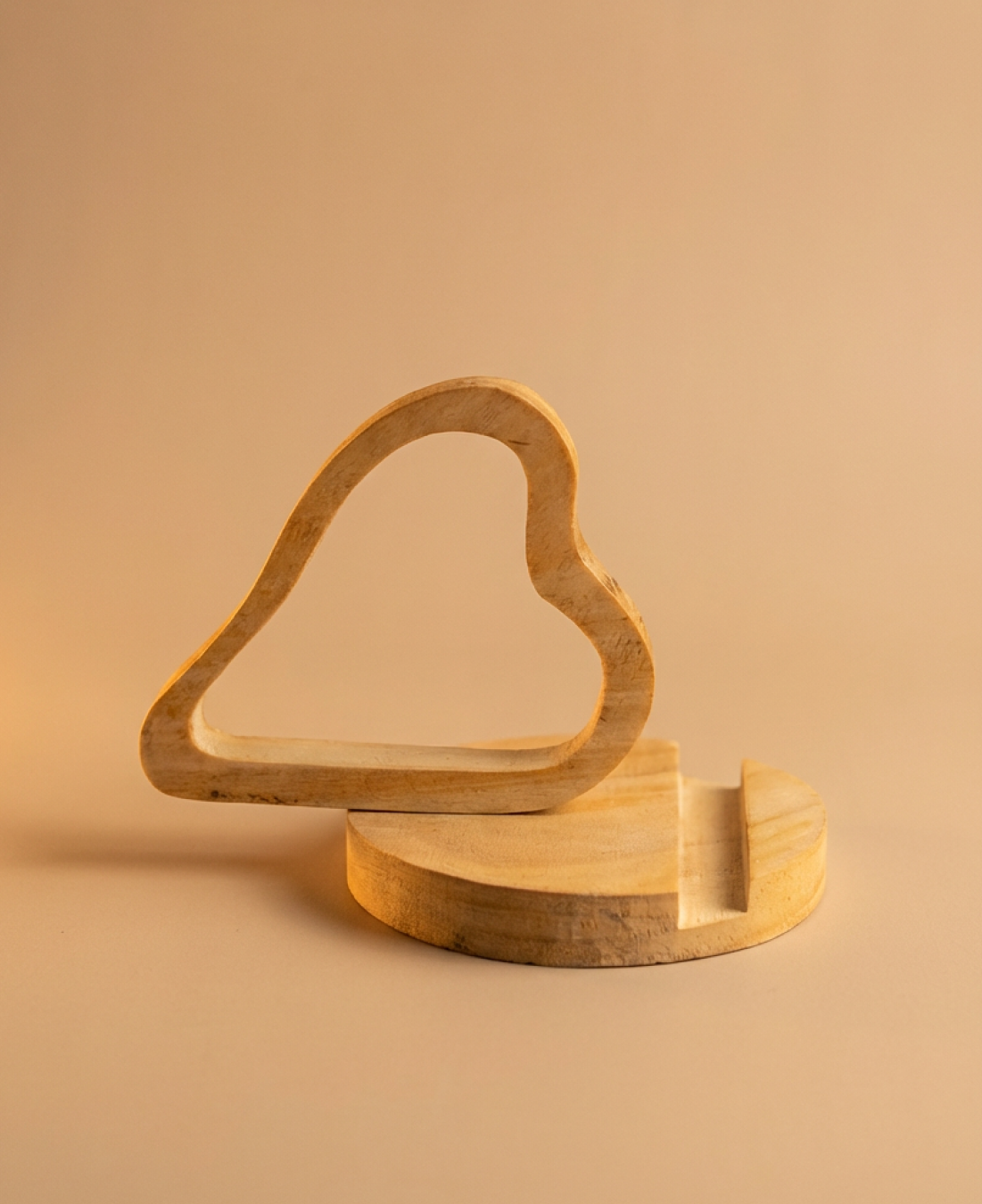 A minimalist heart-shaped wooden phone stand, handcrafted to hold your smartphone with elegance, stability, and warmth. The solid wooden base ensures stability, while the precision-cut slot securely supports your phone in a vertical viewing position.