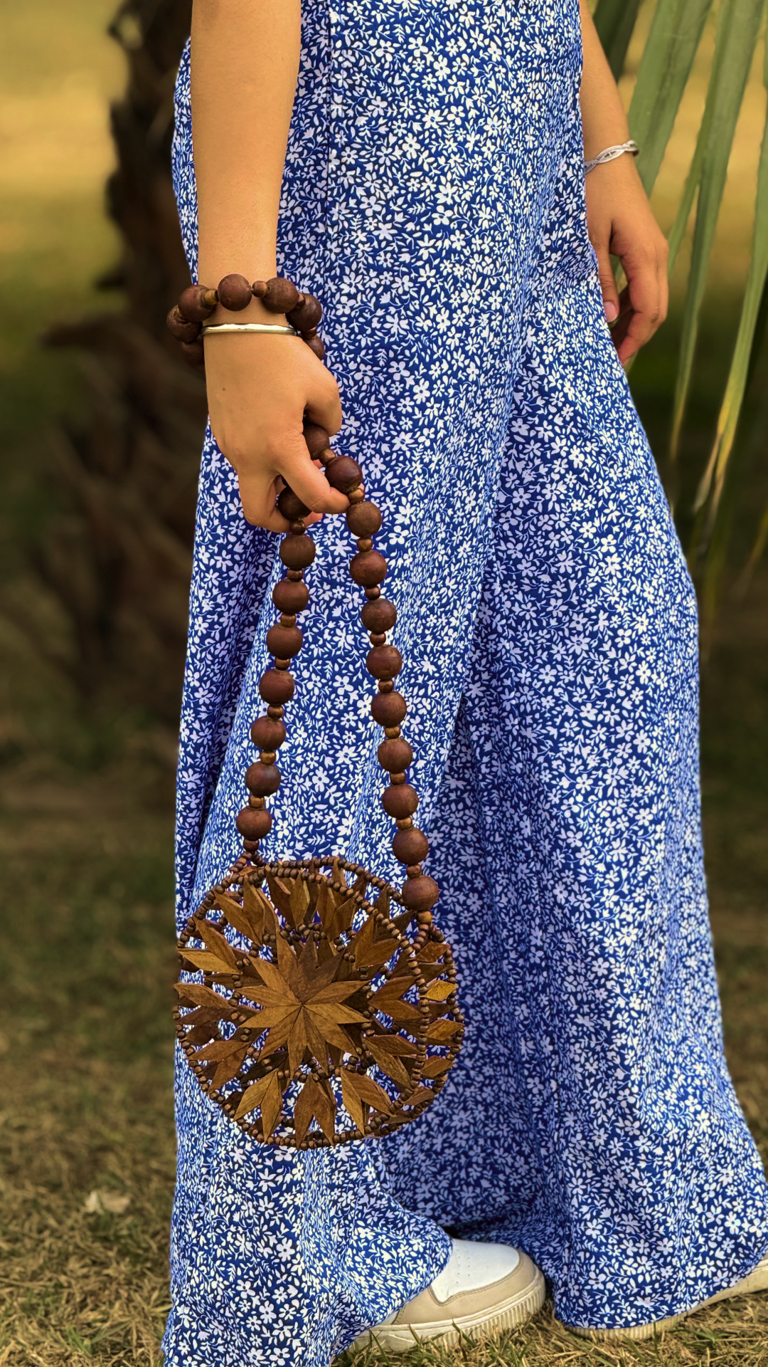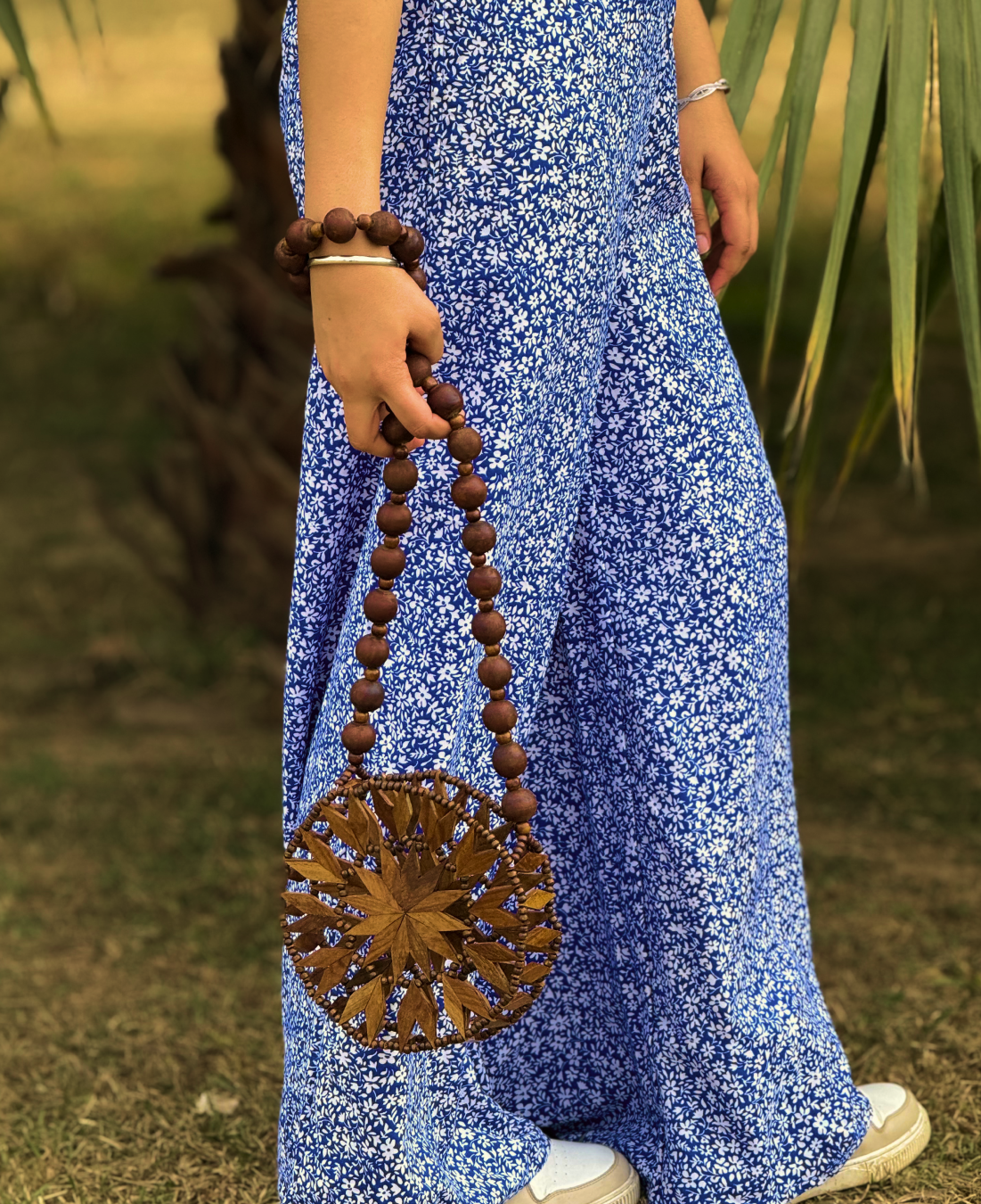 The round silhouette is complemented by a hand-strung wooden bead handle, offering both elegance and comfort. Lightweight yet sturdy, this bag is perfect for carrying essentials while adding an artistic, earthy charm to your outfit.