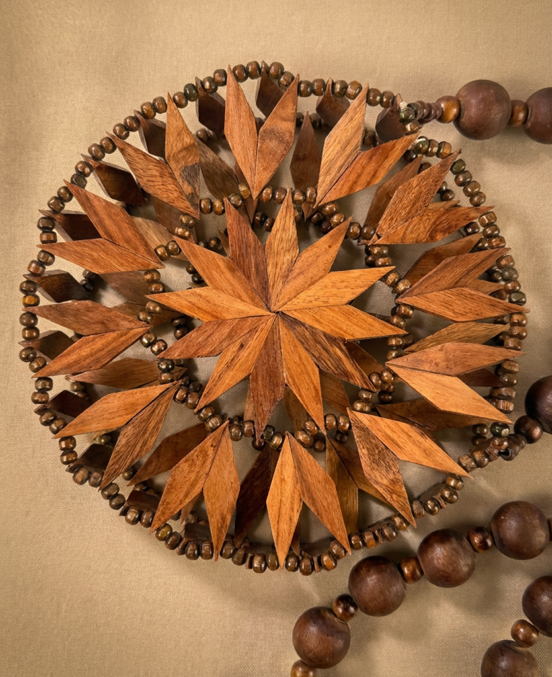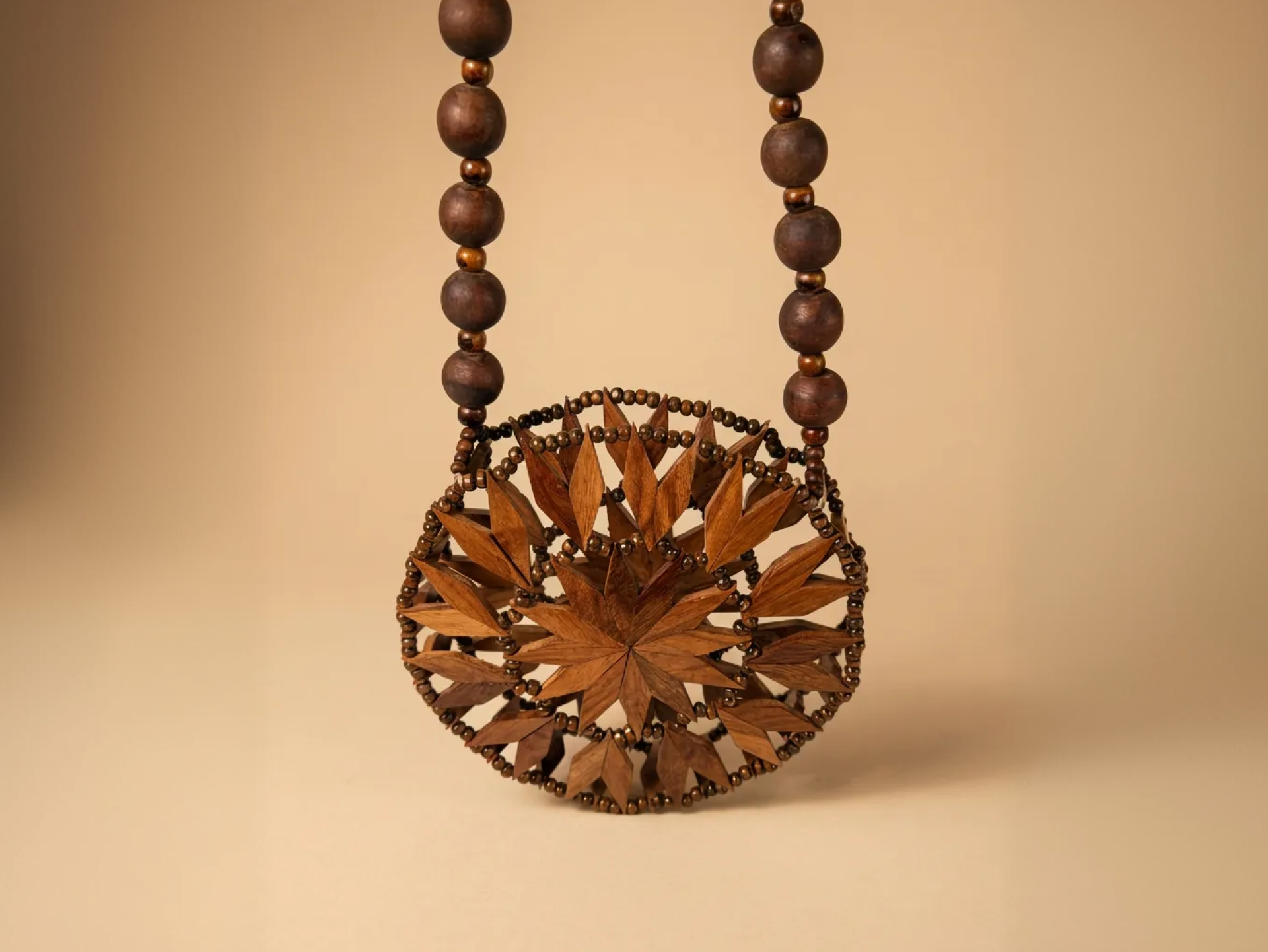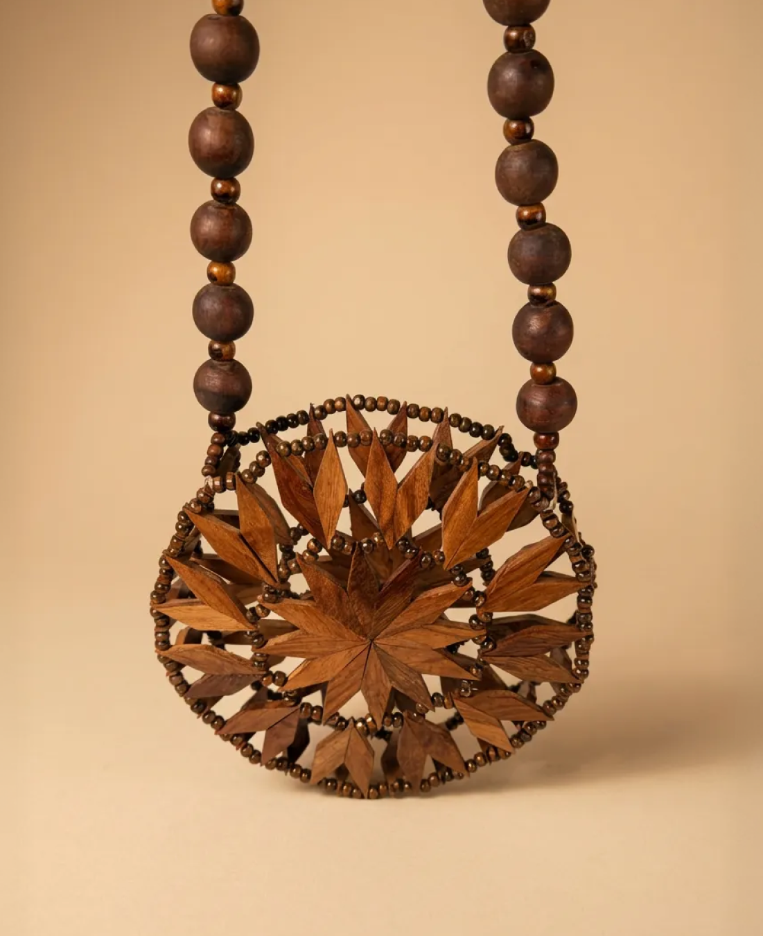 Inspired by sacred geometry and traditional craftsmanship, this handcrafted wooden handbag is a true statement of slow fashion. Featuring an intricate mandala-style wooden pattern, the bag is carefully assembled using hand-cut wooden pieces and finished with a smooth, polished surface that highlights the natural grain.